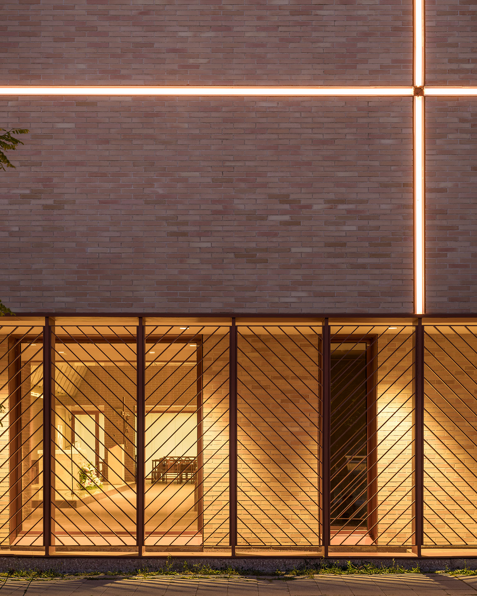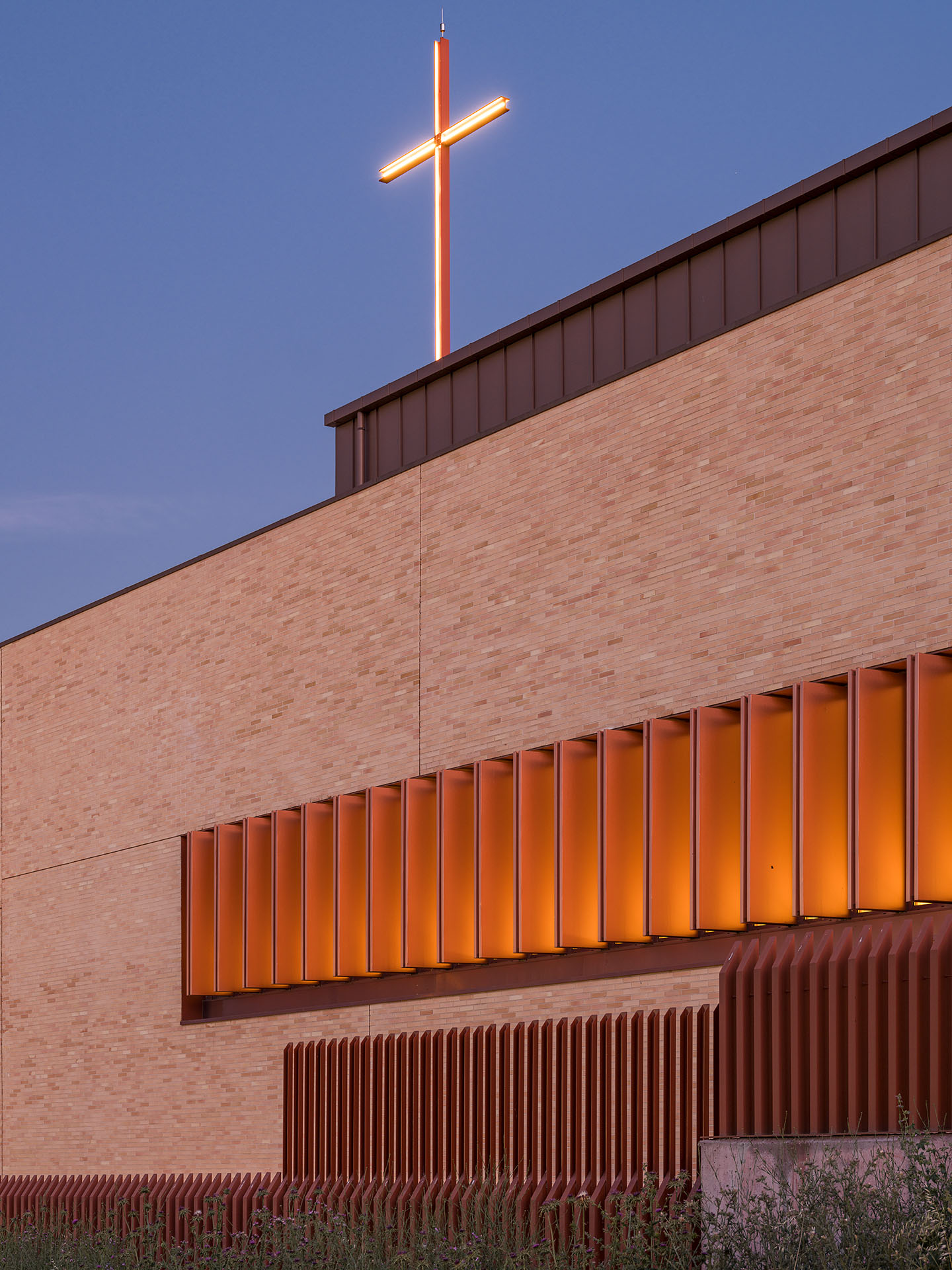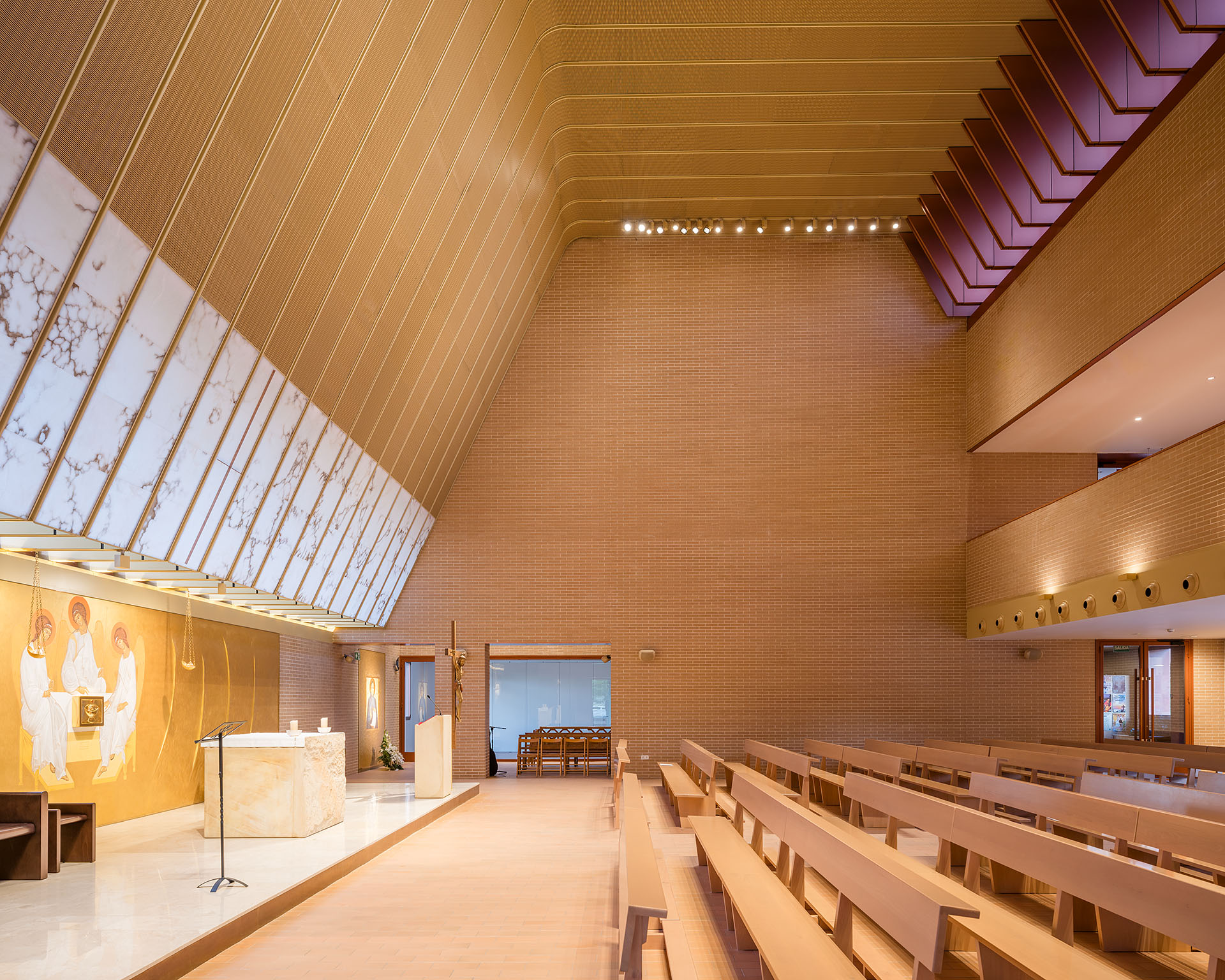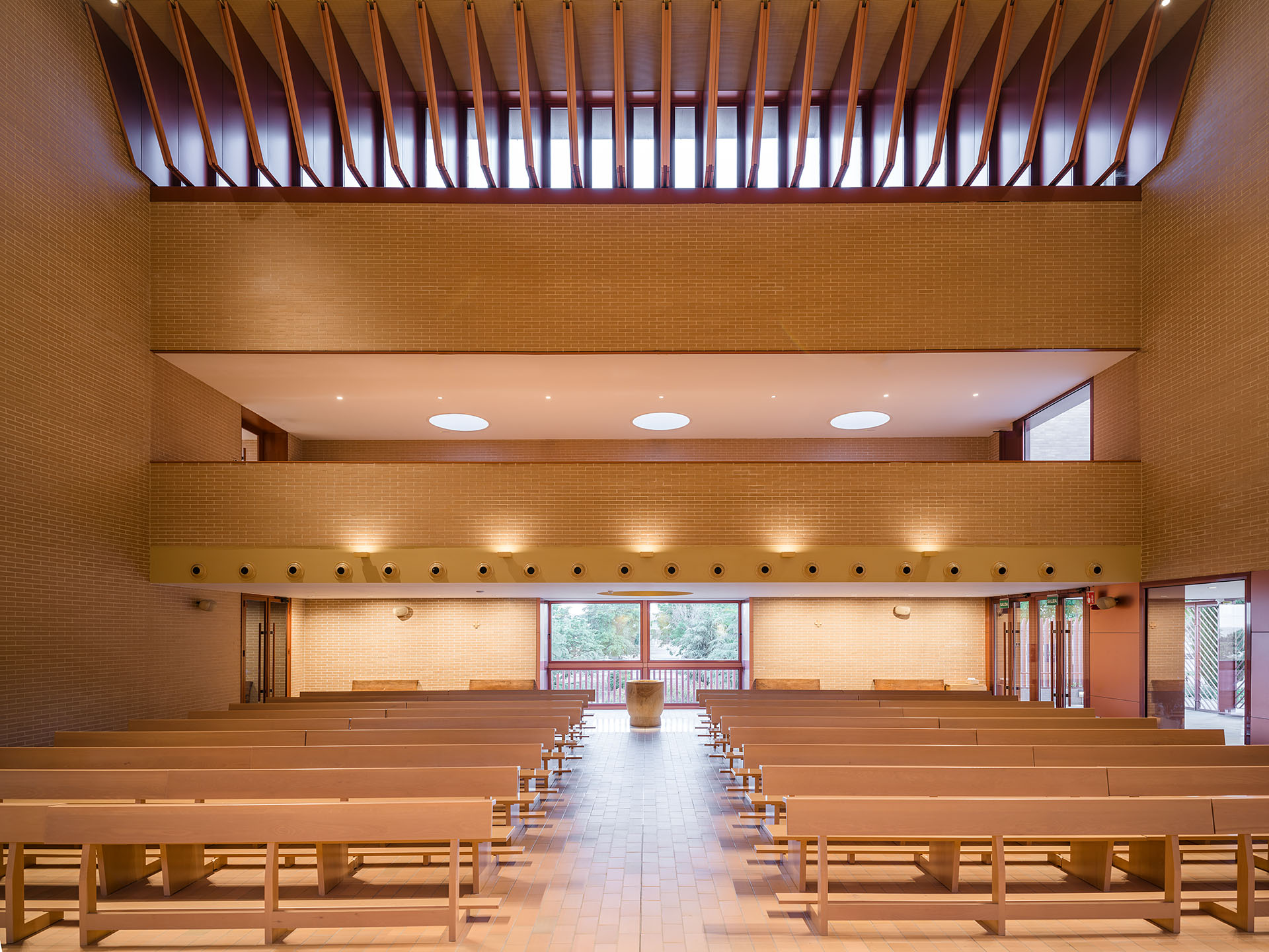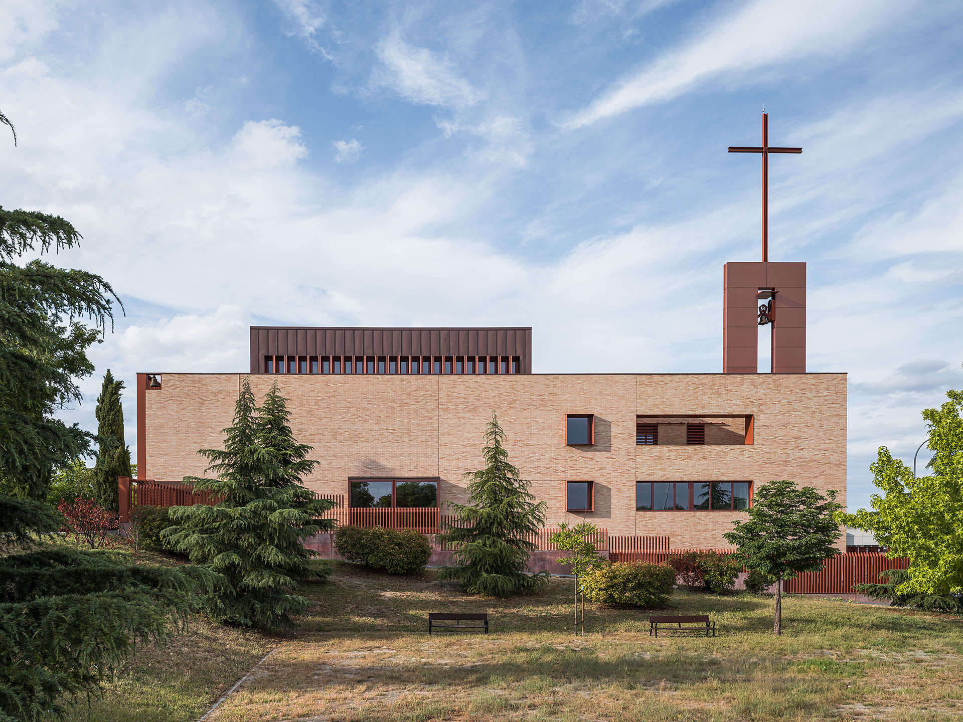 La fachada, ejecutada en ladrillo visto, potencia la unidad del conjunto y se integra con el entorno. La entrada principal, con amplio porche, conecta con el templo bajo el coro, mientras que en el nivel inferior se distribuyen la capilla, salas de reunión, despachos parroquiales y rectoría. “El ladrillo no solo dota de identidad al edificio, sino que genera continuidad entre interior y exterior”, señalan desde tresunouno. El campanario y la cruz, situados en la esquina suroeste, emergen sobre la volumetría compacta para destacar la presencia del centro en el barrio.