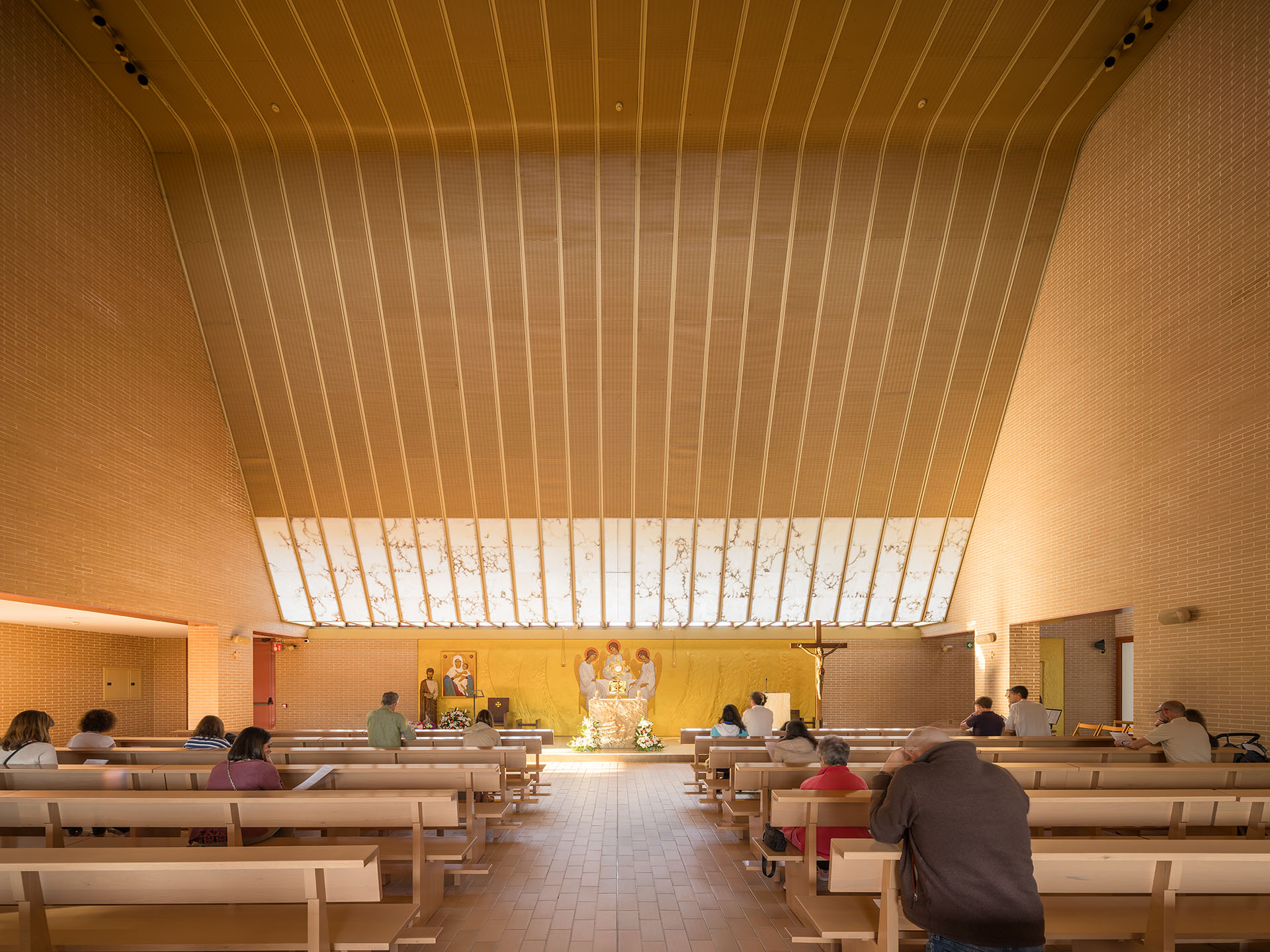 En el interior, se busca tamizar la luz y crear un ambiente solemne y agradable. Huecos corridos y costillas de aluminio texturizado regulan la iluminación sobre el altar y el coro, mientras que el alabastro aporta elegancia al espacio sacro. Además, las instalaciones se ubican en la crujía de fachada principal, liberando las cubiertas y optimizando la integración visual. Como apunta el equipo de arquitectos, “cada decisión busca equilibrar funcionalidad, contexto y experiencia espacial para los usuarios del centro”.
