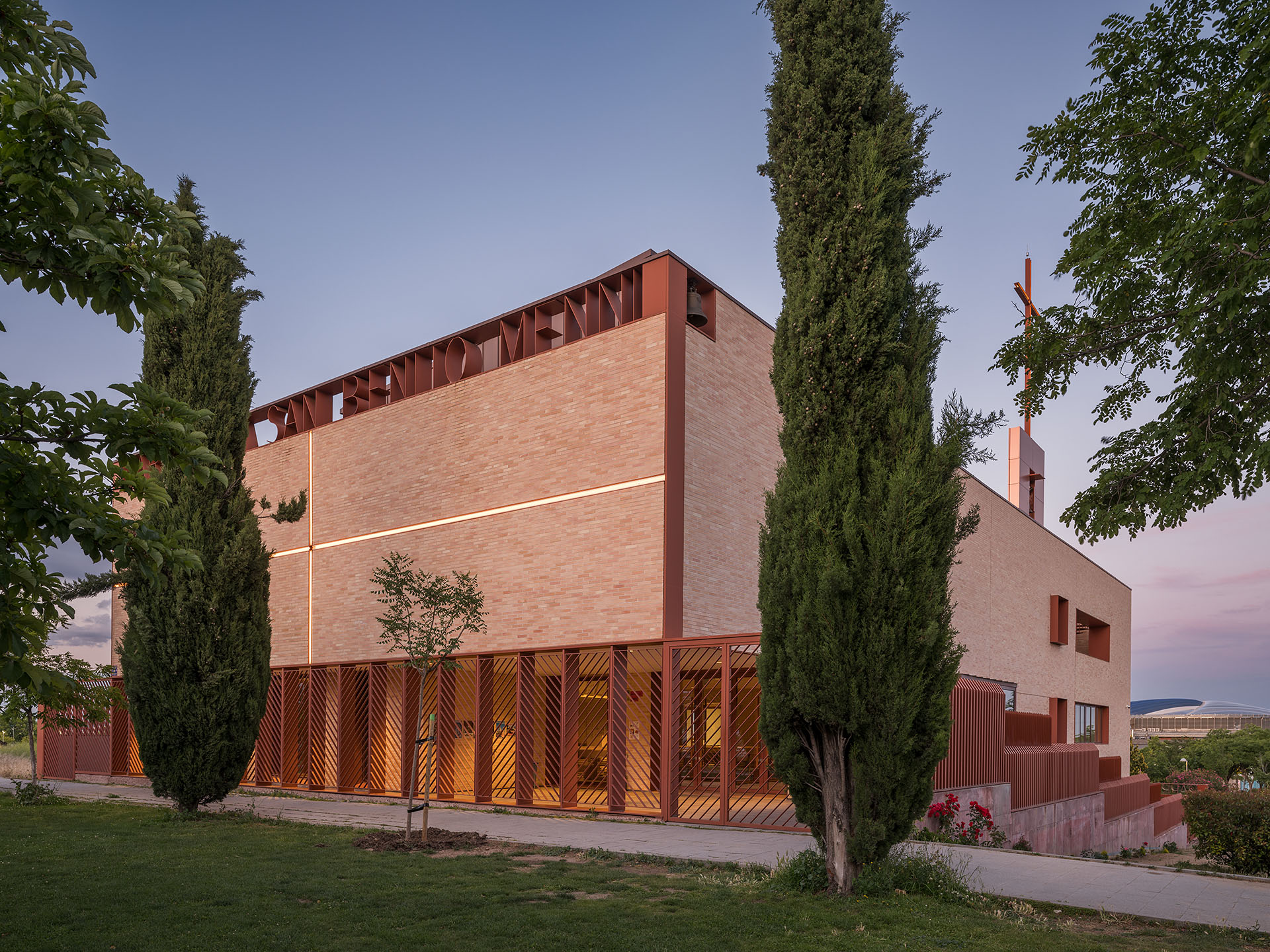 El Centro Parroquial San Benito Menni, proyectado por el estudio tresunouno, se emplaza en un solar con fuerte pendiente que conecta la Vía Lusitana con la calle Catorce Olivas en Madrid. La presencia de un pequeño parque contiguo permite al edificio ocupar una posición de esquina y ofrecer gran visibilidad. La volumetría compacta se articula en dos zonas alrededor de una crujía central de comunicaciones y servicios, adaptándose a los diferentes niveles de acceso y facilitando la construcción por fases, de manera que la parroquia anterior pudiera mantenerse operativa durante la obra.