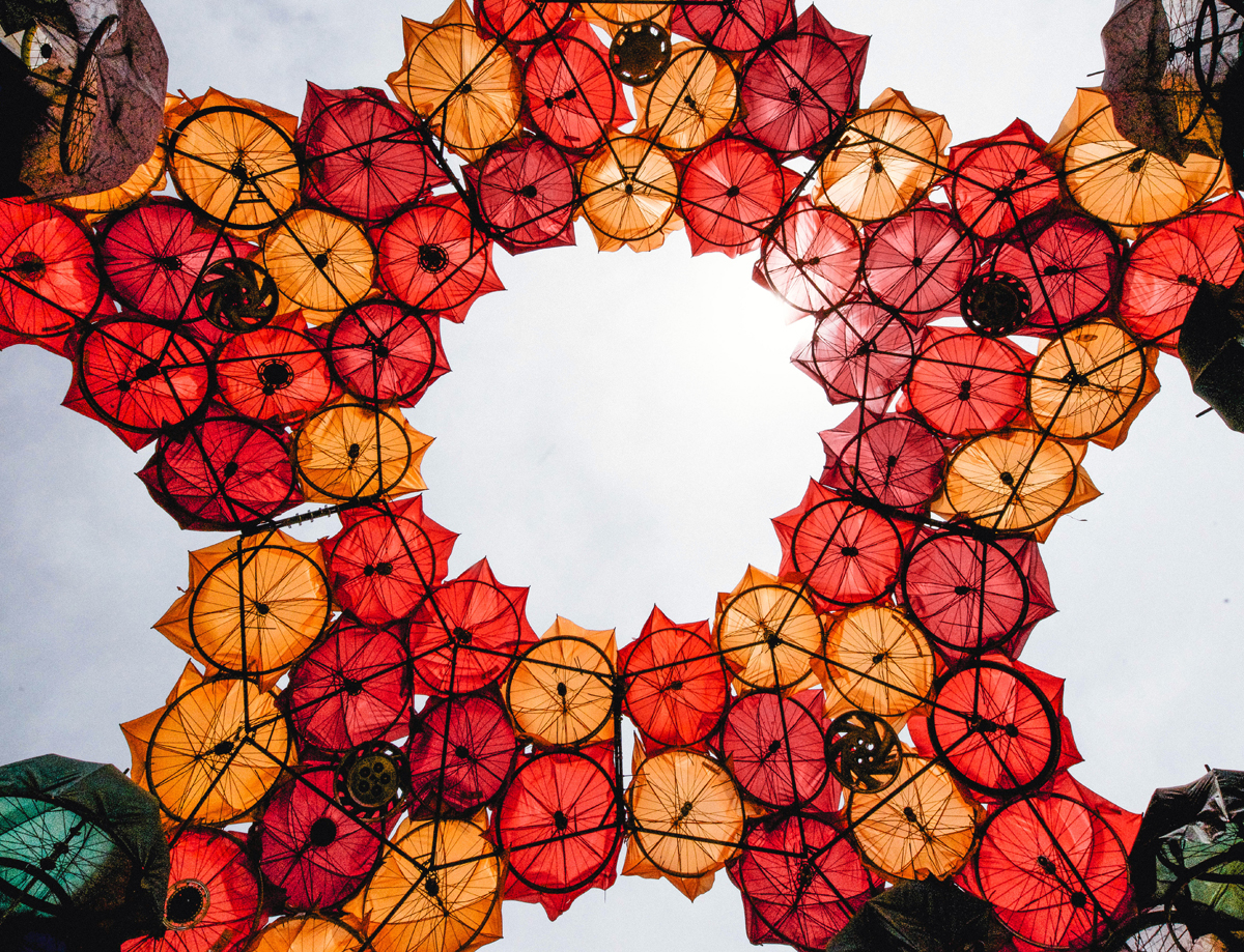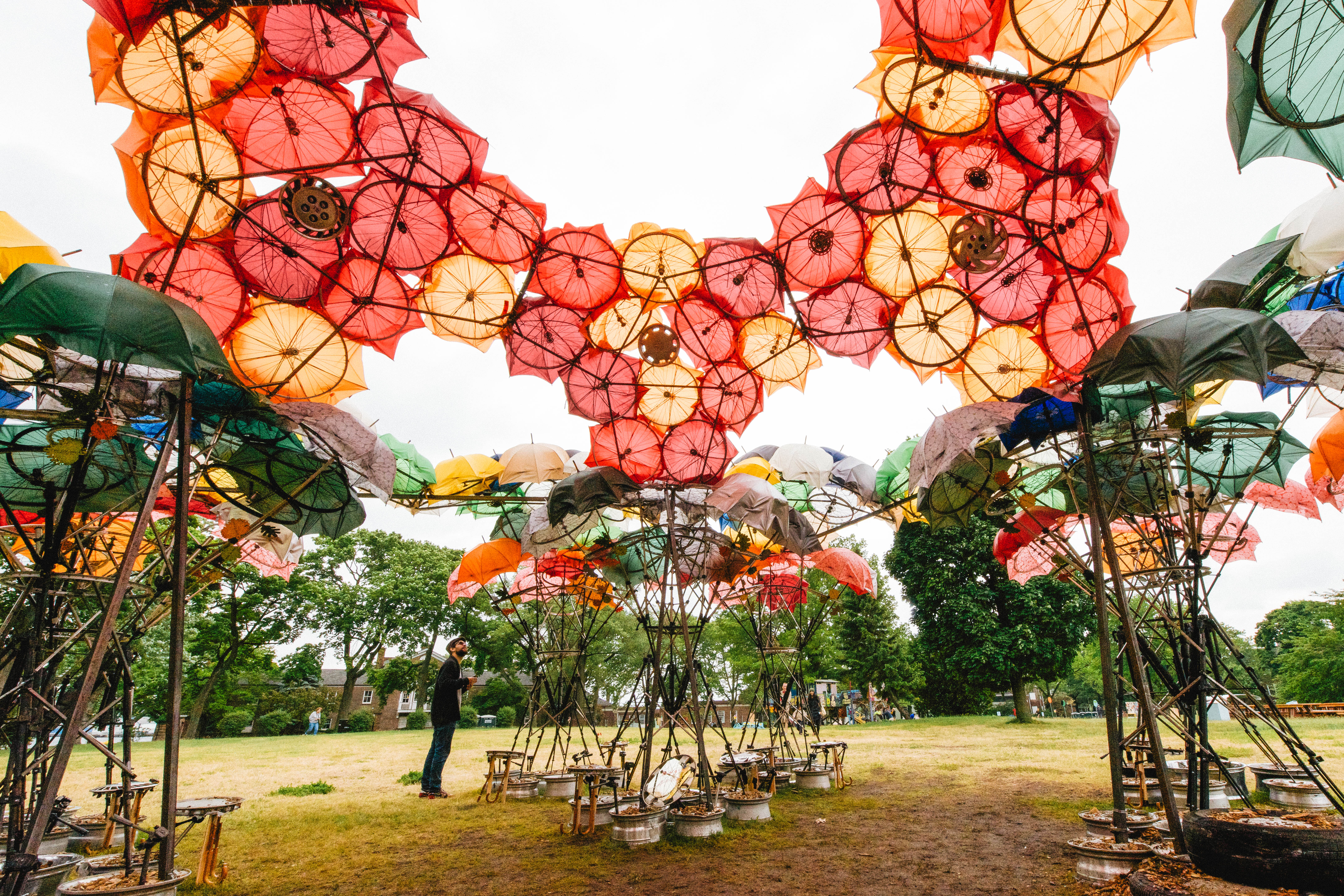 The proposed design employs commonly found materials, giving them a new life after they have become unfit for their original purpose. The design utilizes broken umbrellas, old stools and damaged bicycle wheels, which several institutions in NY are already recycling. As with mop-head flowers, the Pavilion is itself composed of many smaller elements, all of which can be dismantled and re-used after the Summer. Branches composed of several umbrellas and tripods, can be easily reused as sun, wind and rain protection in outdoor spaces all around the city. Larger elements can be beautiful indoor chandeliers and both elements can be useful for community centers or NGOs.