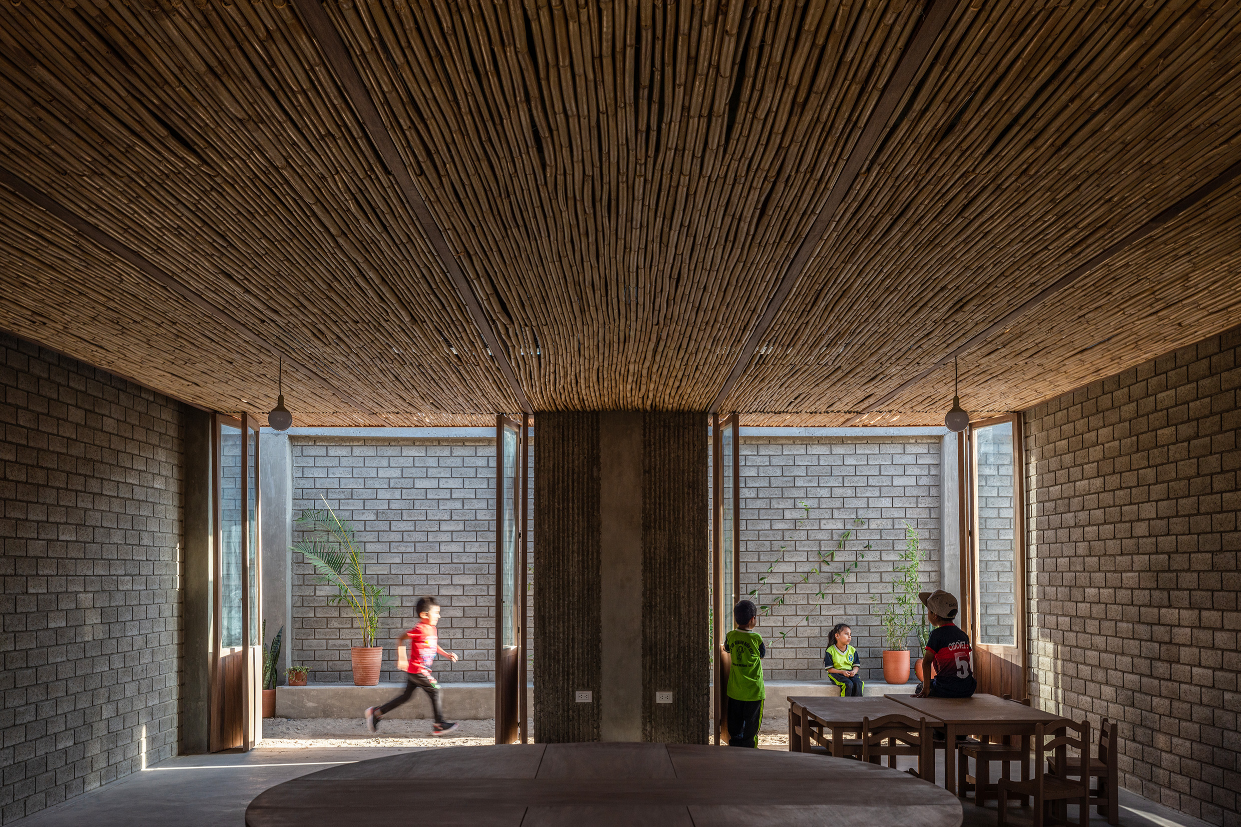 Villacuri es un asentamiento humano en el desierto peruano resultado de una invasión que comenzó hace 25 años. Carece de planificación urbana y solo cuenta con escasos comercios cerca de la carretera. La falta de atención gubernamental ha afectado a la población vulnerable, incluyendo la escuela, que no ha sido reconstruida desde un terremoto en 2007. La ONG All Hands and Hearts decidió reconstruir la escuela en 2019. La identidad del lugar se basa en la diversidad de culturas y las técnicas constructivas utilizadas. El diseño utiliza materiales locales que ayudan a que la propia comunidad pueda sentirse identificada y a dignificar los métodos constructivos locales. Se implementaron soluciones para combatir el calor del desierto y mejorar la seguridad, privacidad y acceso fácil a los padres. En general, el proyecto refleja la dureza del entorno y resalta elementos locales como la caña brava y la estera.