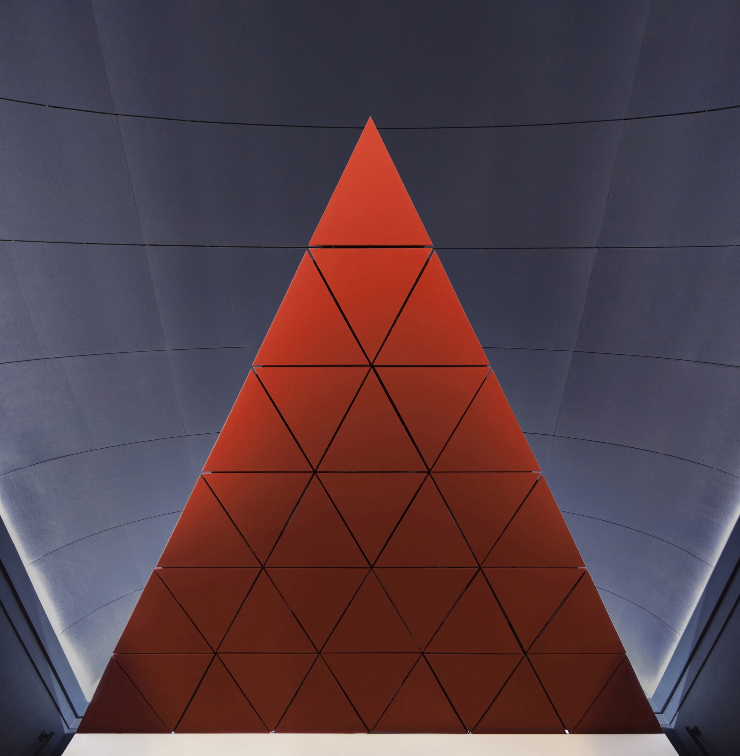 El reto era doble: conservar las piezas icónicas del proyecto de Bach y Mora —la sala de proyección triangular y el triángulo suspendido sobre el escenario— y, al mismo tiempo, dotar al espacio de una nueva identidad cinematográfica. La solución convierte el triángulo suspendido en una gran pantalla acústica, modifica la platea para mejorar la visibilidad y refuerza la atmósfera con un juego cromático que remite a la tradición teatral y cinematográfica: el azul de la bóveda como cielo nocturno y el rojo clásico de los cines históricos.